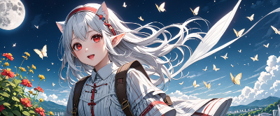 8K,(((masterpiece,best quality,Ultra extremely detailed,perfect anatomy,detailed))),((cowboy shot, from_above:1.5,Child elf,wearing pouch)),wolf_cat white hair,(looking at viewer),(opening mouth:1.5),smile,blush,lipstick,full fresh lips,big hip,((red_Eye:1.5, Eye Reflections, reflect strong highlight in eyes)), solo,hairband,wave shining white hair, stripe cute_suit_dress,BREAK,big bag,moon, garden,butterfly,birds, blueberries,flowers,clouds,city_in_distance,<lora:hairdetailer:1> <lora:make25d_type1_v100:1>,,