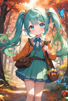 masterpiece, best quality, extremely detailed, anime, girl, skirthatsunemiku,VOCALOID,tie,twintail,longhair,blue hair,green hair,blue eyes,bag,fantasy,colorful,butterfly,autumn,forest,flower,Colorfulmushroom,grapes,chestnut,Matsutake mushroom,mini skirt,elf,smile,my child,LollipopCandy,PastelCalla,magic