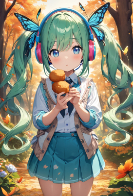 masterpiece, best quality, extremely detailed, anime, girl, skirthatsunemiku,VOCALOID,tie,twintail,longhair,blue hair,green hair,blue eyes,bag,fantasy,colorful,butterfly,autumn,forest,flower,Colorfulmushroom,grapes,chestnut,Matsutake mushroom,mini skirt,elf,smile,my child,LollipopCandy,PastelCalla,magic