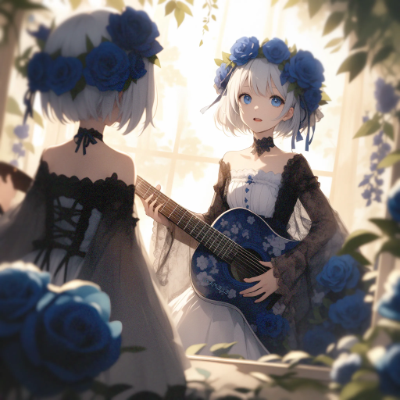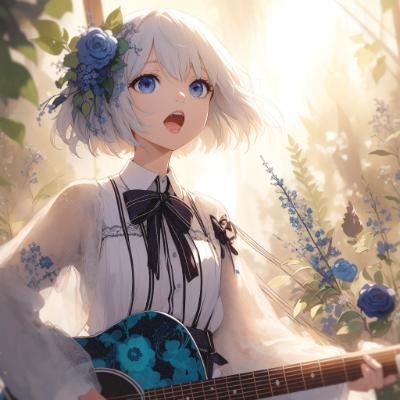 (Plant background:1.3), (extremely detailed fine touch:1.3), (hard light, studio light, light rays, dappled light, reflection, shadows, ray tracing:1.0), (rough sketch:1.3), (2D:1.3), ///, Plant background, blurred background, anime style, light coloring, thin lines, delicate expression, beautiful light expression, sunlight filtering through the trees, girl with short white hair, singing expression, blue floral guitar, gothic lolita, sing a song, open mouth