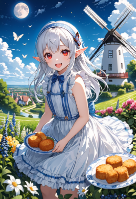 8K,(((masterpiece,best quality,Ultra extremely detailed,perfect anatomy,detailed))),((cowboy shot, from_above:1.5,Child elf,eating croquette on lanch sheet)),wolf_cat white hair,(looking at viewer),(opening mouth:1.5),smile,blush,lipstick,full fresh lips,big hip,((red_Eye:1.5, Eye Reflections, reflect strong highlight in eyes)), solo,hairband,wave shining white hair, plant pring stripe see-through clothsuit_dress,BREAK,lanch box, meals, moon, garden,butterfly,birds, many croquette on dish,shooting_star,blueberries,flowers,large_windmill,clouds,city_in_distance,<lora:hairdetailer:1> <lora:make25d_type1_v100:1>,,,