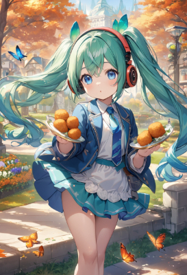 masterpiece, best quality, extremely detailed, anime, girl, skirt,hatsunemiku,VOCALOID,tie,Headphones,mini skirt,twintail,longhair,blue hair,green hair,blue eyes,croquette,fantasy,colorful,flower,butterfly,park,my child,city,autumn