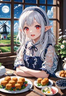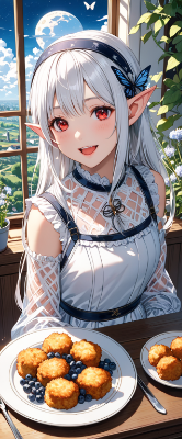 8K,(((masterpiece,best quality,Ultra extremely detailed,perfect anatomy,detailed))),((close-up head, from_front:1.5,Child elf,hiding her arms)),wolf_cat white hair,(looking at viewer),(opening mouth:1.5),smile,blush,lipstick,full fresh lips,big hip,((red_Eye:1.5, Eye Reflections, reflect strong highlight in eyes)), solo,hairband,wave shining white hair, plant pring stripe see-through cloth_dress,BREAK,in meal shop,large windows.lanch box, meals, moon, garden,butterfly,birds, many croquette on dish,shooting_star,blueberries,flowers,large_windmill,clouds,city_in_distance,<lora:hairdetailer:1> <lora:make25d_type1_v100:1>,,,