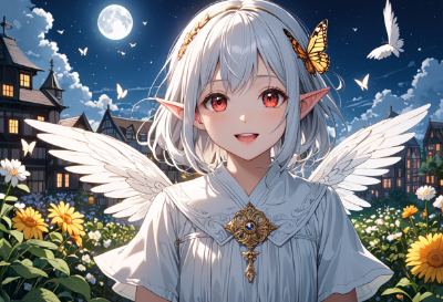 8K,(((masterpiece,best quality,Ultra extremely detailed,perfect anatomy,detailed))),((close-up head, from_front:1.5,Child elf,hiding her arms)),wolf_cat white hair,(looking at viewer),(opening mouth:1.5),smile,blush,lipstick,full fresh lips,big hip,((red_Eye:1.5, Eye Reflections, reflect strong highlight in eyes)), solo,hairband,wave shining white hair, plant pring stripe see-through cloth_dress,BREAK,in meal shop,large windows.lanch box, meals, moon, garden,butterfly,birds, many croquette on dish,shooting_star,blueberries,flowers,large_windmill,clouds,city_in_distance,<lora:hairdetailer:1> <lora:make25d_type1_v100:1>,,,,