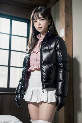 (photorealistic:1.4), (RAW photo), masterpiece, best quality, extremely detailed, lady, long straight hair, almond shaped eyes, drooping eyes, cold gaze, fearless smile, staring, standing, BREAK, (enamel, shiny:1.3), down jacket, puffer jacket, zip up, closed zipper, frills mini skirt, knee high boots, (pink leather long gloves:1.2), <lora:hime_style-1.0r8:1> ,