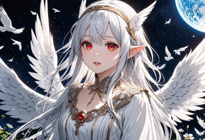 8K,(((masterpiece,best quality,Ultra extremely detailed,perfect anatomy,detailed))),((close-up head, from_front:1.5,Child elf with angel wing and angel light ring,hiding her arms)),wolf_cat white hair,(looking at viewer),(opening mouth:1.5),smile,blush,lipstick,full fresh lips,big hip,((red_Eye:1.5, Eye Reflections, reflect strong highlight in eyes)), solo,hairband,wave shining white hair, plant pring stripe see-through white cloth_dress,BREAK,large windows, moon, garden,butterfly,many white birds,shooting_star,flowers,large_windmill,clouds,city_in_distance,<lora:hairdetailer:1> <lora:make25d_type1_v100:1>,,