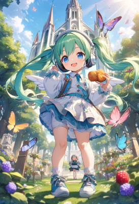 masterpiece, best quality, extremely detailed, anime, girl, skirtHatsune Miku, VOCALOID, virtual idol, 1girl, twin tails, long hair, blue hair, green hair, blue eyes, headphones, idol, starry sky, tie, sleeveless, mini skirt, black arm cover, black long boots, space, planet,angel,fantasy,wing,cyberpunk,science fiction