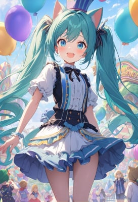 masterpiece, best quality, extremely detailed, anime, girl, skirtProsca, Hatsune Miku, Wonderlands Showtime, Cat Ears, 1girl, Twin Tails, Long Hair, Blue Hair, Green Hair, Amusement Park, Live Stage, Colorful, Balloons,twintail,longhair,blue hair,purple hair,blue eyes,angel,colorful,fantasy