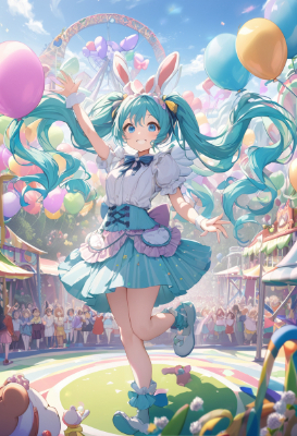 masterpiece, best quality, extremely detailed, anime, girl, skirtProsca, Hatsune Miku, Wonderlands Showtime, Cat Ears, 1girl, Twin Tails, Long Hair, Blue Hair, Green Hair, Amusement Park, Live Stage, Colorful, Balloons,twintail,longhair,blue hair,purple hair,blue eyes,angel,colorful,fantasy,Happysmile,wing,magic,flower,butterfly,rabbit costume,Teddy bear