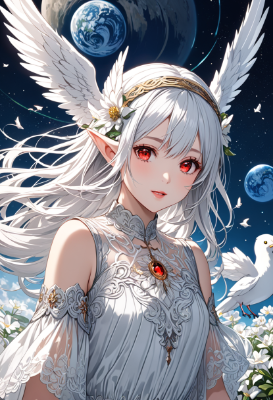 8K,(((masterpiece,best quality,Ultra extremely detailed,perfect anatomy,detailed))),((close-up head,Child elf with angel wing,angel_ring:1.5,hiding her arms,angel style)),wolf_cat white hair,(looking at viewer),(opening mouth:1.5),smile,blush,lipstick,full fresh lips,big hip,((red_Eye:1.5, Eye Reflections, reflect strong highlight in eyes)), solo,hairband,wave shining white hair, plant pring stripe see-through white cloth_dress,BREAK,huge big planet of earth, moon, many white birds,shooting_star,flowers,clouds,<lora:hairdetailer:1> <lora:make25d_type1_v100:1>,