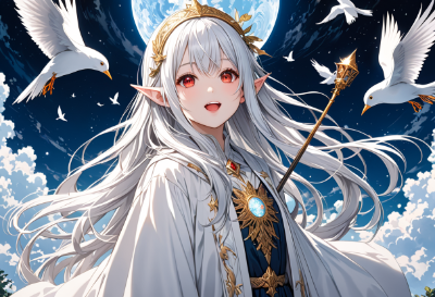 8K,(((masterpiece,best quality,Ultra extremely detailed,perfect anatomy,detailed))),((close-up head,Child elf wearing genius white robe,hiding her arms,genius angel style)),wolf_cat white hair,(looking at viewer),(opening mouth:1.5),smile,blush,lipstick,full fresh lips,big hip,((red_Eye:1.5, Eye Reflections, reflect strong highlight in eyes)), solo,hairband,wave shining white hair, plant pring stripe see-through white cloth_dress,BREAK,huge big planet of earth, moon, many white birds,shooting_star,flowers,clouds,<lora:hairdetailer:1> <lora:make25d_type1_v100:1>,,