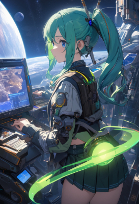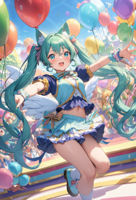masterpiece, best quality, extremely detailed, anime, girl, skirtIllustration of Hatsune Miku, VOCALOID, necktie, 1girl, twin tails, long hair, blue hair, green hair, blue eyes, headphones, and an idol standing on a live stage. The costume has a gorgeous design with frills and ribbons. Colourful spotlights shine in the background. pastel colors, my child, colorful, balloons, amusement park,twintail,longhair,genius,fantasy,magic