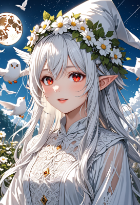 8K,(((masterpiece,best quality,Ultra extremely detailed,perfect anatomy,detailed))),((close-up head,wizard hat ,Child elf wearing genius white robe,hiding her arms,genius angel style)),wolf_cat white hair,(looking at viewer),(opening mouth:1.5),smile,blush,lipstick,full fresh lips,big hip,((red_Eye:1.5, Eye Reflections, reflect strong highlight in eyes)), solo,hairband,wave shining white hair, plant pring stripe see-through white cloth_dress,BREAK,huge big planet of earth, moon, many white birds,shooting_star,flowers,clouds,<lora:hairdetailer:1> <lora:make25d_type1_v100:1>,,,
