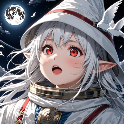8K,(((masterpiece,best quality,Ultra extremely detailed,perfect anatomy,detailed))),((cowbow-shot head,wizard hat ,Child elf wearing genius white robe,hiding her arms,genius angel style)),wolf_cat white hair,(looking at viewer),(opening mouth:1.5),smile,blush,lipstick,full fresh lips,big hip,((red_Eye:1.5, Eye Reflections, reflect strong highlight in eyes)), solo,hairband,wave shining white hair, plant pring stripe see-through white cloth_dress,BREAK,huge big planet of sneaker, moon, many white birds,shooting_star,flowers,clouds,<lora:hairdetailer:1> <lora:make25d_type1_v100:1>,,,,