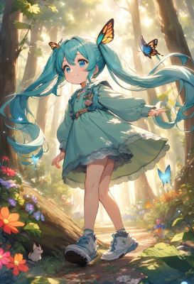masterpiece, best quality, extremely detailed, anime, girl, skirtHatsune Miku, 1girl, twin tails, long hair, blue hair, green hair, blue eyes, in the woods, sunlight filtering through the trees, forest , fairy, flower, butterfly, fantastic,grape, chestnut, mushroom,twintail,longhair,sneakers,fantasy,colorful,smile,autumn,my child,cosmos,long sleeve,pumpkin