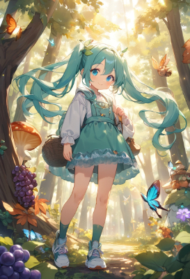 masterpiece, best quality, extremely detailed, anime, girl, skirtHatsune Miku, 1girl, twin tails, long hair, blue hair, green hair, blue eyes, in the woods, sunlight filtering through the trees, forest , fairy, flower, butterfly, fantastic,grape, chestnut, mushroom,twintail,longhair,sneakers,fantasy,colorful,smile,autumn,my child,cosmos,long sleeve,PastelCalla,whitegrape