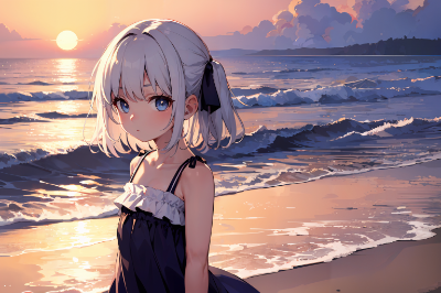 very cute female child,10 yo,white hair,bangs,medium hair,blue eyes,flat chest,hair ribbon,