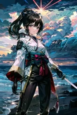 masterpiece, best_quality, ultra-detailed, extremely_detailed_eyes, delicate_and_intricate_hair, extremely_detailed_body, perfect_anatomy, dynamic_angle, dutch_angle, dynamic_light, caustics, cowboy_shot, looking_at_viewer, solo, 1girl, (young_girl:1.5), black_hair, short_hair, blue_eyes, :>, closed_mouth, bare_shoulders, armpits, bare_arms, small_breasts, stomach, navel, thighs, wet, arm_up, swimsuit, side-tie_bikini, day, outdoors, blue_sky, cloud, sky, water, wading, water_drop, air_bubble, bubble, <lora:add_detail:1>
