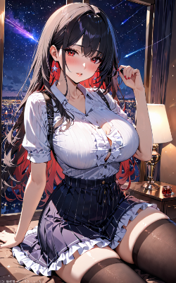 (best quality),(masterpiece),(ultra detailed),1girl, solo, red eyes, black hair, long hair, large breasts, casual clothes, striped patterned shirt, skirt, thighhighs, hair ornament, flower ornament, earrings, wristband,