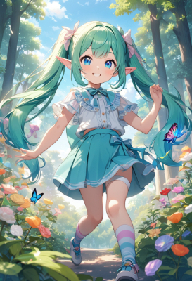 masterpiece, best quality, extremely detailed, anime, girl, skirt,hatsunemiku,VOCALOID,mini skirt,twintail,longhair,blue hair,green hair,blue eyes,stripe,ry sky,summer, at , at ,smile,clear sky,park,flower,forest,PastelCalla,elf,fairy,butterfly,stripesocks,LollipopCandy,colorful,my child