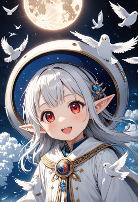 8K,(((masterpiece,best quality,Ultra extremely detailed,perfect anatomy,detailed))),((close-up head ,flying,wizard hat ,Child elf wearing genius white robe)),wolf_cat white hair,sit,(looking at viewer),(opening mouth:1.5),smile,blush,lipstick,full fresh lips,big hip,((red_Eye:1.5, Eye Reflections, reflect strong highlight in eyes)), solo,hairband,waving shining white hair, plant pring,stripe , see-through cloth_dress,BREAK,planet of earth,in space, moon, many white birds,shooting_star,flowers,clouds,<lora:hairdetailer:1> <lora:make25d_type1_v100:1>,,,