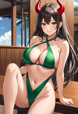 masterpiece, best quality, extremely detailed, anime, 1girl, solo, droopy eyes, dark brown hair, long hair, brown eyes, huge breasts, wide ass, side boobs, succubus, devil wings, twisted devil horns, (green swimsuit high leg swimsuit, slingshot swimsuit, criss-cross halter, cleavage, navel:1.3), standing, smile, blush, side boobs, navel, highheel, sitting on table, crossing legs, smile, blush, open eyes, closed mouth, <lora:hairdetailer:0> <lora:eyecolle_torenia_v100:1>