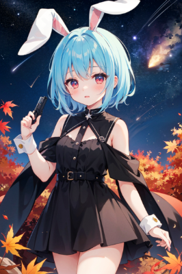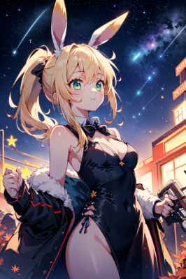 girl,wet hair,silver hair,red eyes,shooting star,ojou-sama,original character,horror,autumn,night,starry sky,night sky,space,different world(A beautiful girl with bunny ears happily gazing at a shooting star under the autumn night sky),cyberpunk