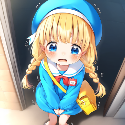 「1人のとても小柄な女性。とても長く明るい金髪、とても長くまっすぐ流れるようなストレートヘアに小さな花飾り。レースの多い水色の長袖のロングワンピースを着て、青色のサッシュをつけている。フラワーモチーフのブレスレットをつけている。青い目。青色の靴を履いている。顔を赤くして優しく微笑んでいる。花畑に立っている。可愛いポーズをしている。とても詳細な描写。アニメ風、アスペクト比は縦長」の絵を描いて。