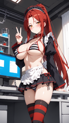 (score_9, score_8_up, score_7_up, score_6_up, score_5_up, score_4_up, source_anime), BREAK,1girl,(glowing eyes:0.5),tall,look at viewer,extremely detailed, anime,masterpiece,8k wallpaper,best quality,detailed face,(perfect quality,beautiful torso,Rich Colors,Brilliant Quality,hughres),BREAK,(shiny skin,shiny hair,pale skin,white skin),(slim,narrow waist),(upper body),(from below:1.2),Dutch angle,good_hands,<lora:pony_good_hands:1>,indoors,blue sky,maid cafe,cafe room,mug,counter,dynamic background,(sexy, seductive body,adult,tall woman:1.2),standing,v arms,skirt grab,hold the skirt,BREAK,Goth girl,Goth girl 1girl,red scarf,mole under eye, mole,red hair,yellow eyes,(forehead,center parted bangs:1.1),ponytail,very long hair,hime style,straight hair,hime cut,draped hair,cascading hair,BREAK,(closed mouth,No expression,embarrassing,blush:1.4),BREAK,(red scarf,wide sleeve,bow, apron, maid, frilled apron,mini skirt:1.3),(spot color,red&black striped pattern knee high socks,chain, black striped pattern thighhigh,red striped pattern thighhigh,zettairyouiki,skindentation:1.2),(red&black striped panties:1.3),BREAK,(navel,cleavage,string bikini,shiny bikini,red&black striped bikini:1.2), (beautiful breasts,big breasts:1.4),<lora:gg3:0.8>, BREAK,