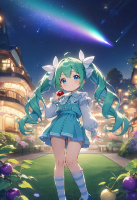 masterpiece, best quality, extremely detailed, anime, girl, skirt,hatsunemiku,VOCALOID,mini skirt,twintail,longhair,blue hair,green hair,blue eyes,stripe,ry , at , at ,smile,clear ,flower,PastelCalla,stripesocks,LollipopCandy,my child,grape,apple,shooting star,starry ,night,park,colorful,small hill,sky,starry sky,city,night view