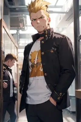 absurdres, highres, ultra detailed, all black haired man, short hair, Gakuran, a man in a black gakuran and pants standing , man wearing the gakuran, golden buttons <lora:Gakuran:0.9>, (((blonde hair))), angry expression, furious, irritated, annoyed,school,((pompadour)),((slicked-back))