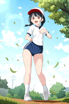 A cute girl, two side up, blonde hair, short hair, orange bobbles, elf ears, orange eyes, gym uniform, red gym shorts, high-waisted shorts, flat chest, standing, anime coloring, white uwabaki, white socks, hallway, best quality, amazing quality, very aesthetic, absurdres