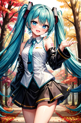 masterpiece, best quality, extremely detailed, anime, girl, skirtmasterpiece, best quality, extremely detailed, anime, girl, skirt,hatsunemiku,VOCALOID,mini skirt,twintail,longhair,blue hair, hair,blue eyes,green,green hair,forest,autumn,Enjoy the taste of autumn,smile
