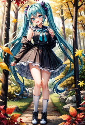 masterpiece, best quality, extremely detailed, anime, girl, skirtmasterpiece, best quality, extremely detailed, anime, girl, skirt,hatsunemiku,VOCALOID,mini skirt,twintail,longhair,blue hair, hair,blue eyes,green,green hair,forest,autumn,Enjoy the taste of autumn,smile,grape,apple,PastelCalla