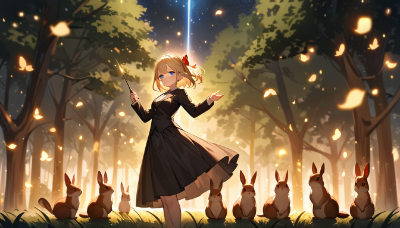 1girl, solo, anime style, short blonde hair, blue eyes, (hair bow:1.4),red bow.red ribbon, angry expression, comical, fist raised, shouting, summer day, intense sunlight, sweat drops, flushed face, short sleeve shirt, white shirt, blue skirt, sandals, standing pose, outdoors, park background, trees, grass, cloudless sky, bright sun, lens flare, heat haze effect, sunflowers, cicadas, fan, water bottle, ice cream melting, sunscreen bottle, sunglasses on head, straw hat blown off, shimmering air, vibrant colors, exaggerated facial features, dynamic composition, motion lines, chibi style elements, simplified shading, flat colors, bold outlines, expressive eyes, cute design, moe aesthetics, slice of life scene, seasonal theme, relatable situation, humorous tone, eye-catching, appealing character design, best quality, amazing quality, very aesthetic, absurdres