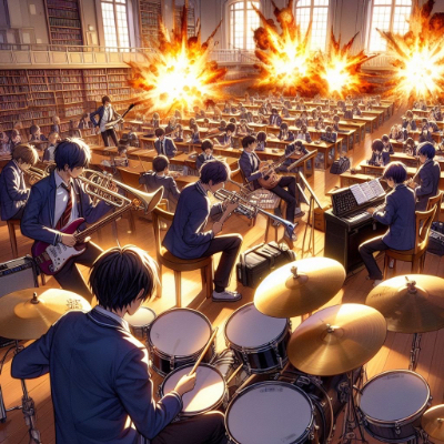 テスト当日。受験会場で集中する先輩を見つけた後輩達。またもや各自用意した楽器で応援歌を演奏するという暴挙に出ました。その後、無事に全員追い出されたようです。めでたし。 (お題:ミュージック) ※前回 https://www.aipictors.com/works/306300/