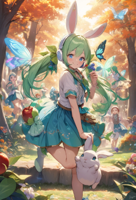 masterpiece, best quality, extremely detailed, anime, girl, skirtmasterpiece, best quality, extremely detailed, anime, girl, skirt,hatsunemiku,VOCALOID,mini skirt,twintail,longhair,blue hair, hair,blue eyes, hair,forest,Enjoy the taste of ,smile,grape,apple,PastelCalla,music,green hair,fairy,fantasy,colorful,park,flower,autumn,butterfly,headphones,animals music troupe,rabbit,concert,my child