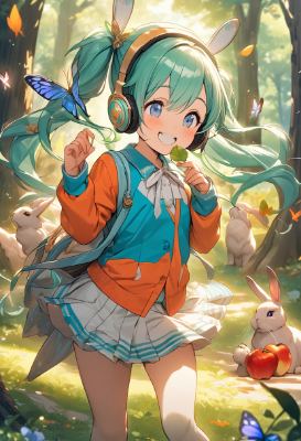 masterpiece, best quality, extremely detailed, anime, girl, skirtmasterpiece, best quality, extremely detailed, anime, girl, skirtHatsune Miku, 1girl, twin tails, long hair, blue hair, green hair, blue eyes, in the woods, sunlight filtering through the trees, forest , fairy, flower, butterfly, fantastic, apple, grape, chestnut, mushroom,twintail,longhair,sneakers,fantasy,colorful,smile,autumn,my child,cosmos,long sleeve,pumpkin,mini skirt,music,park