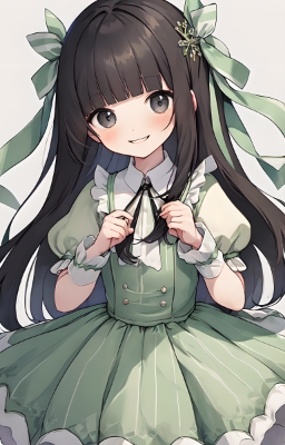 1 girl,(((very longest hair))),smile, Black hair,flowing hair,straight Hair,hair ribbon,mintgreen stripe,Black Eyes,flat chest,straight Across bangs,princess Cut, Very Long Sideburn,roundry Head,Droping eyes,cute,Meekness,Bob Cut,long back hair,12 years old,two side up