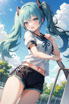 hatsunemiku,VOCALOID,masterpiece, best quality, extremely detailed, anime, girl, ((masterpiece)), ((high resolution)), ((best quality)), (ultra-detailed), anime, ((extremely detailed)), 4K, (8K), best quality, dynamic angle, (beautiful), solo, (hatsune miku), (buruma), gym uniform, smile, outdoors,longhair,mini ,blue hair,green hair,blue eyes,two side up,school,1girl, twin tails, long hair, blue hair, green hair, blue eyes, 1girl, wearing short sleeve school gym uniform, shorts, sports , school playground,Sports day,smile,clear sky,blue sky