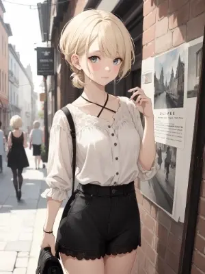 (blurry background:1.3), (extremely detailed fine touch:1.3), ///, girl, light blonde short hair, chignon, mixed media, diverse materials, unexpected combinations, creative exploration, vibrant composition, town, fashionable street, cute store, Looking at the city from a tall building, a strong wind blew her hair