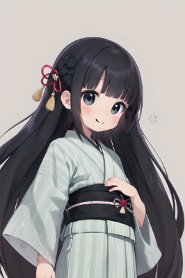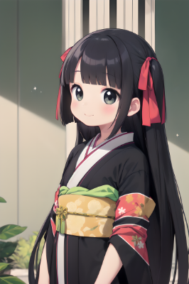 1 girl,(((very longest hair))),smile, Black hair,flowing hair,straight Hair,hair ribbon,mintgreen stripe,Black Eyes,flat chest,straight Across bangs,princess Cut, Very Long Sideburn,roundry Head,Droping eyes,cute,Meekness,Bob Cut,long back hair,12 years old,dodgeball,Holding ball