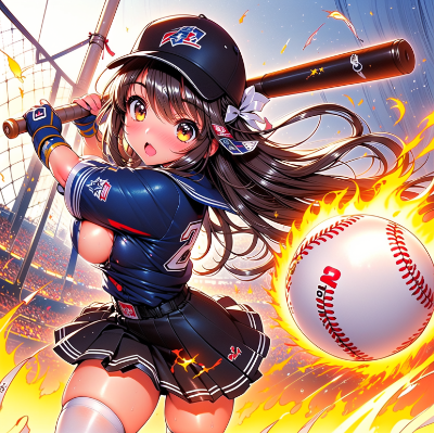 masterpiece, best quality, very aesthetic, highres, ultra-detailed, (detailed clothing:1.3), (detailed body:1.2), An anime-style image of a teenage girl in a dynamic baseball scene. She is preparing to swing a bat at a flaming baseball, with a determined expression on her face. She wears a navy-blue baseball uniform with the number 3 on it, along with a matching cap. Her long hair flows behind her, adorned with ribbons. The fiery baseball is mid-flight, surrounded by bright flames, adding intensity to the scene. The background shows a baseball stadium with a crowd watching, and the overall atmosphere is action-packed and energetic, with vibrant lighting and fiery effects, Meticulous Eyelash Details, an extremely cute and beautiful girl, very Cute face, ((((big tits)))), big ass, white thighhighs, breasts apart, breast curtains, sideboob, underboob, nice hands, perfect hands, more prism, vibrant color,(perfect eyes:0.8), (detailed eyes:1),intricate colors, vibrant colors, color detail,The girl I like the most