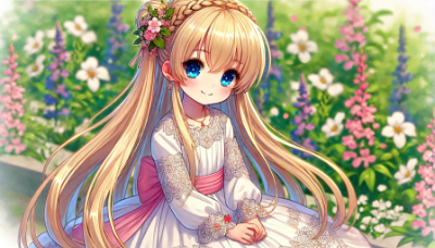 「1人のとても小柄な女性。とても長く明るい金髪、とても長くまっすぐ流れるようなストレートヘアを青色のリボンでツーサイドアップにしている。学校の制服の紺色セーラー服を着ている。青い目。顔を赤くして優しく微笑んでいる。花畑に立っている。とても詳細な描写。全身の絵。アニメ風、アスペクト比は縦長」の絵を描いて。