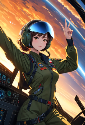 傑作, 最高品質, 超詳細な, masterpiece, more_details:-1, more_details:0, more_details:0.5, more_details:1, more_details:1.5, 1 pilot woman with medium breasts with helmet on head wearing military pilot suits, standing on AV8-B wing near the cockpit, looking at veiwer, making peacesign, song and dance,extremely fine and beautiful colors,extremely beautiful and fain design,amazing sapraizz,dynamic production ,cinematiclighting <lora:saturation:1> <lora:make25d_type4_v100:1>