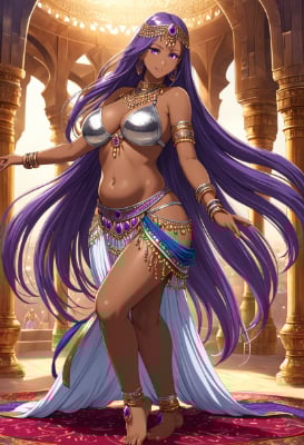 masterpiece, best quality, extremely detailed, anime, 1girl, solo, long hair, purple hair, forehead, hair intakes, green eyes, pointy ears, huge breasts, red highleg leotard, off shoulder, open mouth, full body, hat, holding staff, purple footwear, earrings, jewelry, purple gloves, boots, purple headwear, high heels, :d,