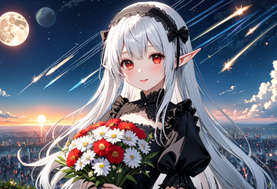8K,(((masterpiece,best quality,Ultra extremely detailed,perfect anatomy,detailed,high resolution)),((upper-body,Child elf wearing sprite black gothic lolita dress )),white hair,opening mouth,smile,blush,lipstick,full fresh lips,big hip,((red_Eye:1.5, Eye Reflections, reflect strong highlight in eyes)), solo, shining two side up white hair waving,hair_band,holding many flowers,BREAK,(bouquet),many flowers,sunrise,big planet of earth, moon, many white birds,((shooting_star)),meteor shower,clouds,city in distance,<lora:hairdetailer:1> <lora:make25d_type1_v100:1>,,