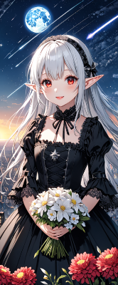 8K,(((masterpiece,best quality,Ultra extremely detailed,perfect anatomy,detailed,high resolution)),((upper-body,Child elf wearing sprite black detailed gothic lolita dress )),white hair,opening mouth,smile,blush,lipstick,full fresh lips,big hip,((red_Eye:1.5, Eye Reflections, reflect strong highlight in eyes)), solo, shining two side up white hair waving,hair_band,holding many flowers,BREAK,(bouquet),many flowers,sunrise,big planet of earth, moon, many white birds,((shooting_star)),meteor shower,clouds,city in distance,<lora:hairdetailer:1> <lora:make25d_type1_v100:1>,,,