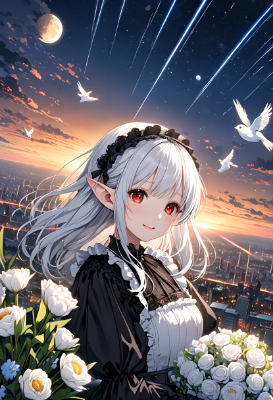 8K,(((masterpiece,best quality,Ultra extremely detailed,perfect anatomy,detailed,high resolution)),((nape of neck,close-up head from back,Child elf wearing sprite detailed gothic lolita dress )),white long hair,opening mouth,smile,blush,lipstick,full fresh lips,big hip,((red_Eye:1.5, Eye Reflections, reflect strong highlight in eyes)), solo, shining long white hair waving,hair_band,holding up many flowers,BREAK,(bouquet),many flowers,sunrise,big planet of earth, moon, many white birds,((shooting_star)),meteor shower,clouds,city in distance,<lora:hairdetailer:1> <lora:make25d_type1_v100:1>,,,,,
