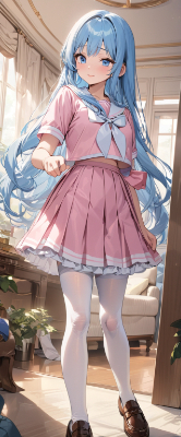 masterpiece,best quality,extremely detailed,anime,girl,skirt,blue hair,blue eyes,light pink color sailor uniform,princess,white stockings,loafer,wink,longhair, <lora:hime_style-1.0r8:1> <lora:hairdetailer:1>,living room